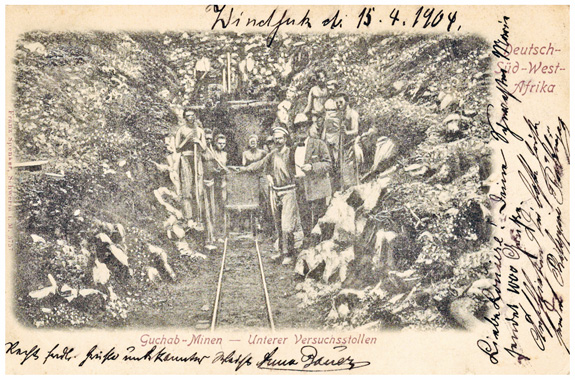 16.04.1904: seltene s/w Ansichtskarte "Guchab-Minen - Unterer Versuchsstollen" mit 5Pf (Mi.12) und Stempel WINDHUK an "Fräulein Louise Reimers" in FLENSBURG (22.5.04). NB: Die Guchab Minen wurden erst um 1908 kommerziell interessant mit dem Ausbau der Otavibahn nach Grootfontein, vorher wurden die gewonnen Kupfererze per Ochsenwagen transportiert.