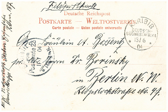 13.06.1904: Feldpost-Ansichtskarte "Schutztruppen-Garten in Otjimbingue" mit Stempel KARIBIB vom Streckenaufseher "Gefreiter Kruse" beim "Maurertrupp klm.187" (kurz hinter Hasis) an ein Fräulein "Bossenz /.. Herrn Dr.Borowsky" in BERLIN (11.7.04).