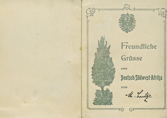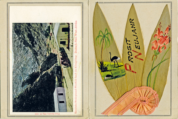 31.12.1904: sehr gut erhaltene Klappkarte aus DSWA im Inneren mit Postkarte vom Khangebirge & schönem Federschmuck mit Neujahrswünschen.