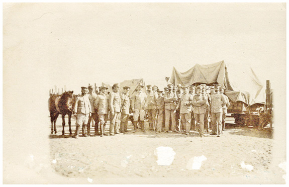 ca. 1905: ungebr. Foto-Ansichtskarte von Offiziersgruppe vor Bahnwagons in Okahandja; Karte unten einige Aufrauhungen.