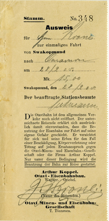 28.02.1905, Eisenbahnausweis: seltener "Stamm Ausweis" der Otavibahn, ausgestellt für "Herrn Kranz", auf der Strecke Swakopmund bis Omaruru für "15,00 Mark" - noch vor der offiziellen Nutzung ab dem 24.8.1905! Tadellose Erhaltung!