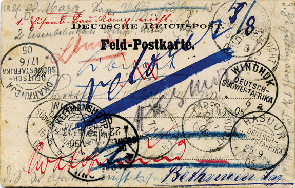 07.06.05: FPK von LÜDERITZBUCHT an einen Sergeanten bei der Eisenbahnkompagnie in Windhuk; mit vielen Nachsendevermerken und insgesamt 12 (!) Stempeln in DSWA umhergesandt, u.a. TrSt von Hasuur, Keetmanshoop, Okahandja & Swakopmund.
