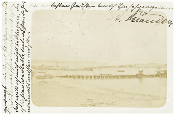 04.02.06: Foto-Ansichtskarte (L´bucht mit 3 Landungsbrücken, die vordere mit Bahnwagons) als Feldpost-Ansichtskarte des Leutnant Oriander von LÜDERITZBUCHT nach Karlsruhe (5.3.05).
