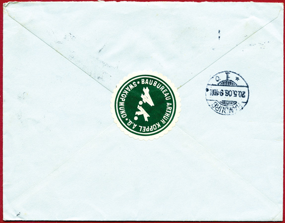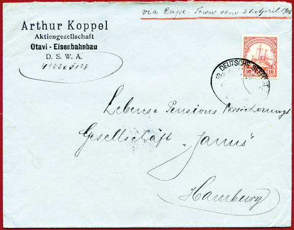 1906: Firmenbrief "Arthur Koppel / Aktiengesellschaft / Otavi-Eisenbahnbau D.S.W.A." rückseitig dunkelgrünes Papiersiege "A.K. BAUBUREAU ARTHUR KOPPEL A.G. SWAKOPMUND, frankiert mit Schiffszeichnung 10Pf (Mi.13) entwertet mit DEUTSCHE SEEPOST; vs Vermerk "via Cape-Town vom 25.April 1906".
