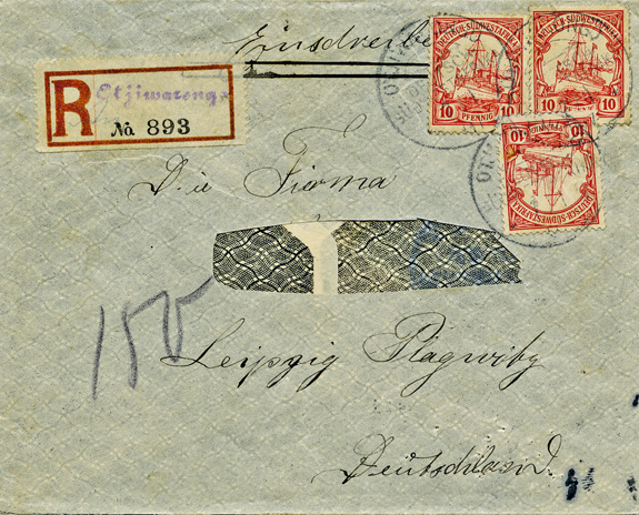 02.01.1907: 3x 10Pf (Mi.13) mit 3x Stempel OTJIWARONGO auf R-Brief mit provisorischem R-Zettel "Otjiwarongo" (Type 2 II) an eine Firma in LEIPZIG-PLAGWITZ (11.2.07) - Firmenname ausgeschnitten. Absender ist "R.Jensen / Streckenwerter / Okaputa 430 / Otavi Bahn / DSW.Afrika". Leichte Mängel, geprüft Czimmek.