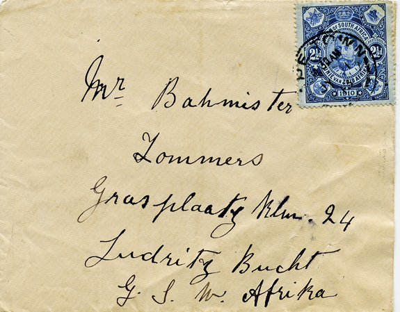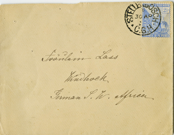 30.04.1906, Incoming mail: CGH 2 1/2d mit Stempel STELLENBOSCH an Fräulein Lass in WINDHOEK (13.5.1903); fehlende Briefklappe.