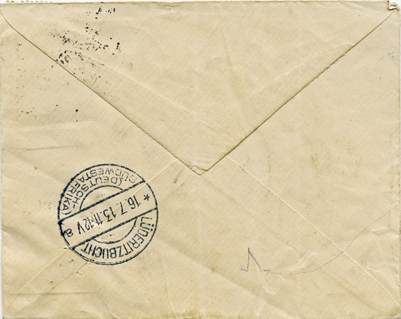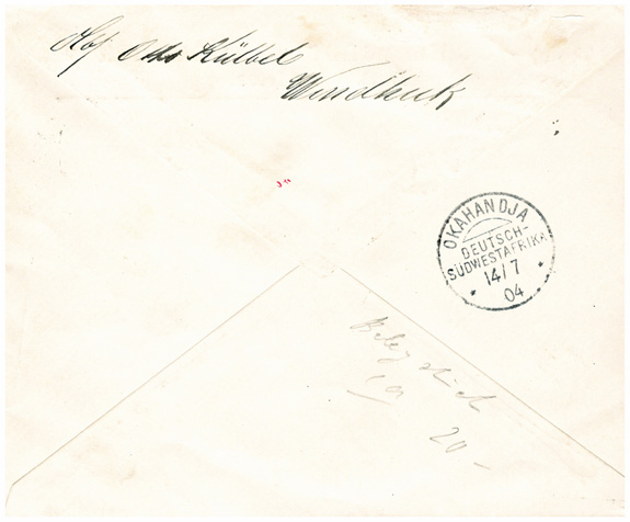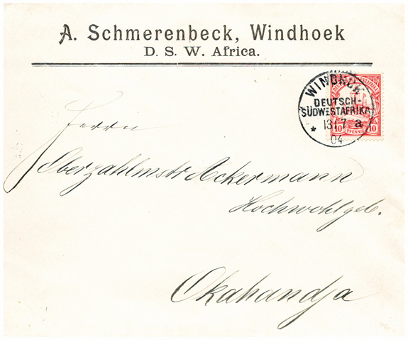 13.07.1904: 10Pf (Mi.13) mit Stempel WINDHUK auf Inlands-Firmenbrief "A.Schmerenbeck, Windhoek.." an den Oberzahlmeister Ackermann in Okahandja (14.7.04).
