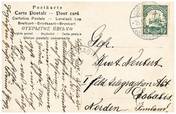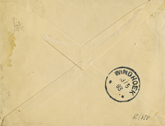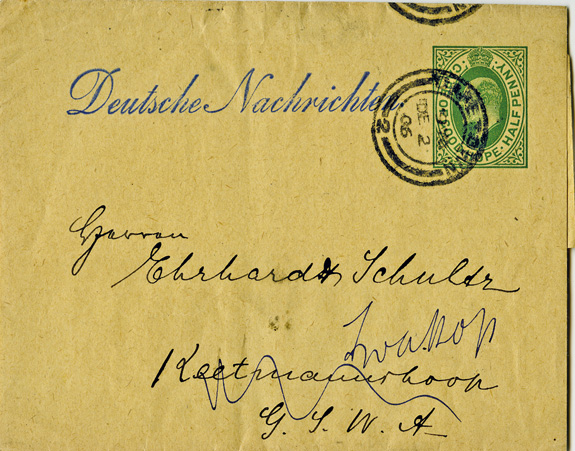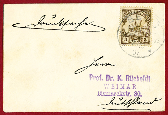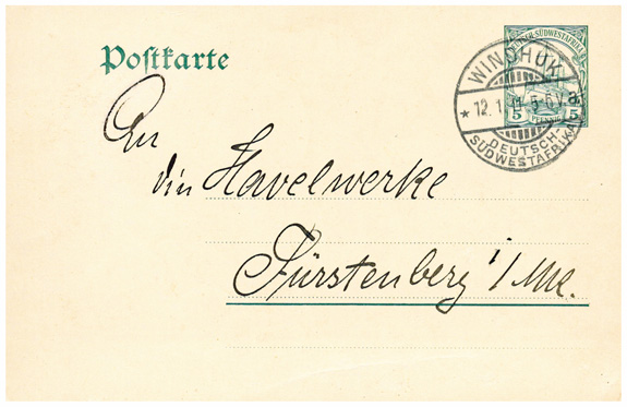 12.01.11: Absenderangabe "von Frankenberg / kaiserlicher Resident im Caprivi- Zipfel" auf 5Pf GSK (Mi.P18) von WINDHUK an die Havelwerke in Fürstenberg. Text: "..Ich bitte umgehenst um Offerten über stählerne Motorboote mittlerer Größe. Dieselben sollen zu Expeditionszwecken auf dem Zambesi und benachbarten Flüßen dienen; starke Konstruktion wegen der Schnellen & Gefährdung durch Flußpferde, geringer Tiefgang, kräftiger Motor (..) die Hefte bitte an mich zu senden nach Schuckmannsburg near Shesheke North-Western Rhodesia via Kapstadt"