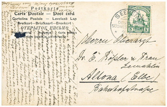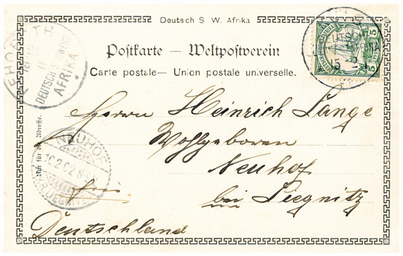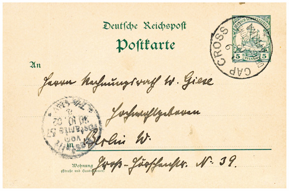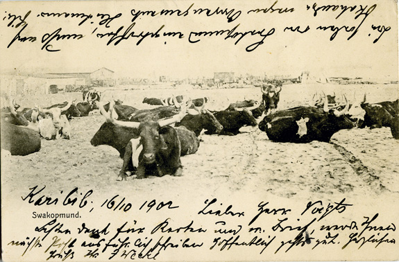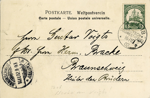 16.10.02: s/w AK "Swakopmund" (Rinder) mit 5Pf (Mi.12) und Stempel KARIBIB an Gustav Voigts in BRAUNSCHWEIG (16.11.02); Absender (späterer Teilhaber von Wecke & Voigts): Fritz Wecke.