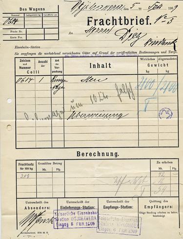 05.02.1909, Frachtbrief: Formular "2718. 05. II" der Reichsdruckerei ausgestellt für einen "Herrn Dietz" in Windhuk mit "Heu" aus OTJIHAVERA (5.2.1909) mit Bahn-Rechteckstempel der Kaiserlichen Eisenbahn, sowie Empfangs Bahn-Rechteckstempel WINDHOEK (6.2.) & Unterschrift quitiert.