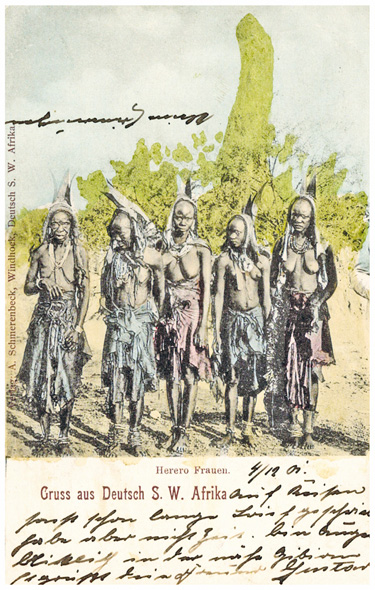 15.12.01: 5Pf (Mi.12) mit Stempel KUIS und Durchgangsstempel REHOBOTH (18.12.) auf AK "Herero Frauen" nach Neuhof (10.2.02).