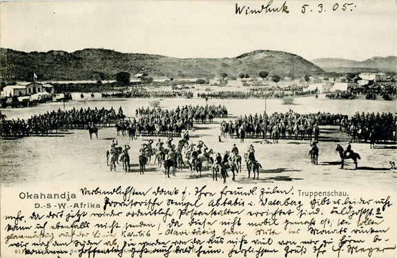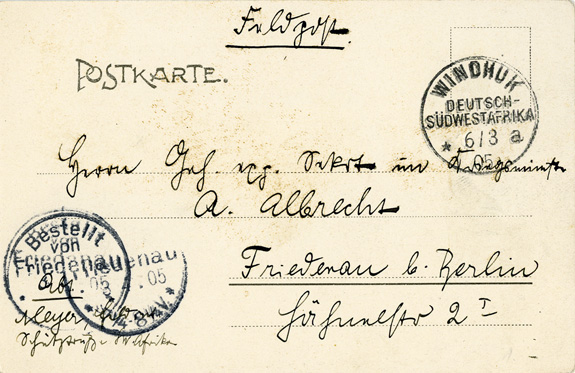 06.03.05: Feldpost-Ansichtskarte (Okahandja - Truppenschau) mit Stempel WINDHUK an den Sammler Albrecht in FRIEDENAU; Offizier Meyer teilt mit: "..provisor. Stempel Abbabis & Waterberg gibt es leider nicht mehr, ..".