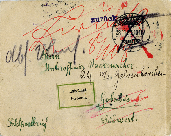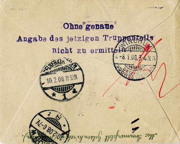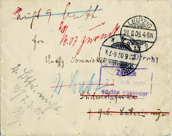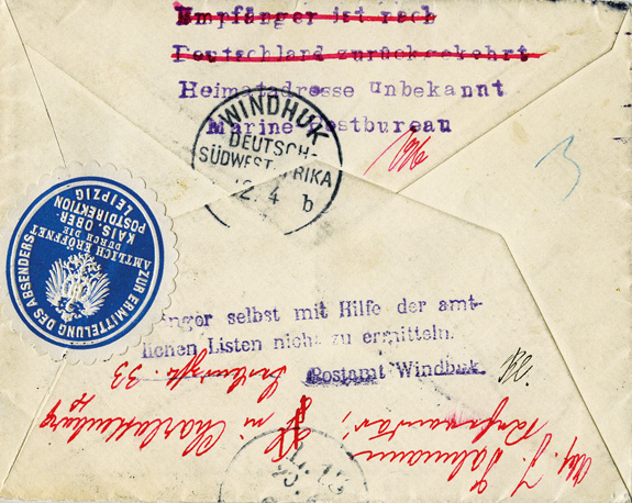 1905/1907: zwei Feldpost-Briefe von den Sammlern Dahmann und Sommerfeldt aus Leipzig bzw. Berlin an unauffindbare Schutztruppler in DSWA, jeweils mit mehreren Hinweisstempeln und Aufklebern zurückgesandt.