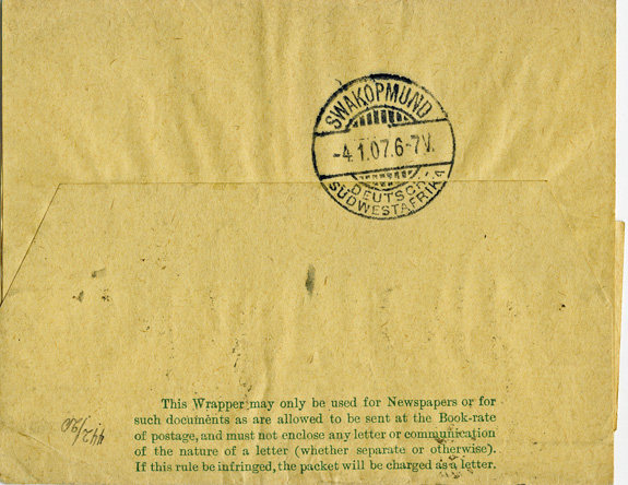02.12.1906, Incoming mail: 1/2 Penny CGH Drucksachenstreifband mit Stempel CAPE TOWN & Zusatzstempel "Deutsche Nachrichten" an Herrn Eduard Schulz in Keetmanshoop, weitergeleitet nach SWAKOPMUND (4.1.07).
