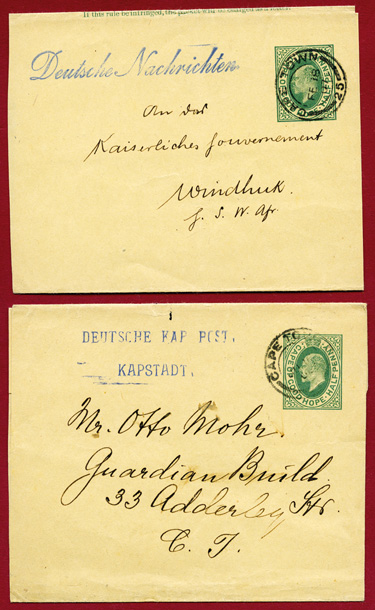 18.02.07: Kapkolonie 1/2 d Ganzsachen-Streifband mit Stempel CAPE TOWN und L1 der Zeitung "Deutsche Nachrichten" an das Kais. Gouvernement in Windhuk. Plus ähnliches Streifband mit L2 "DEUTSCHE KAP POST / KAPSTADT" .