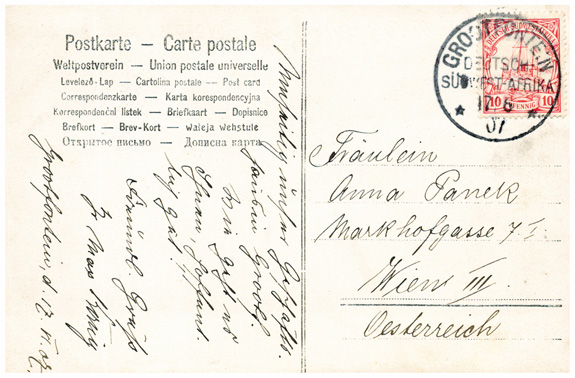 17.06.07: 10Pfg (Mi.26) mit Stempel GROOTFONTEIN auf schöner Foto-Ansichtskarte "Geschäftshaus des Kaufmanns Max König in Grootfontein" nach Wien.