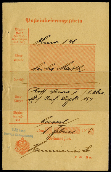 01.02.05: Posteinlieferungsschein "C.62. IIa." mit L2 "Gibeon/Deutsch- Südwestafrika" für einen Wertbrief mit Angabe "sechs Mark" nach Kassel.