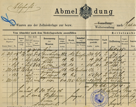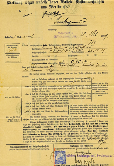 30.03.1906, Formular: Zollformular (No.625) zur "Abmeldung von Waaren aus der Zollniederlage zur bezw. Weitersendung nach Okahandja..", mit einer Auflistung unterschiedlicher Positionen von Swakopmund an den Zoll in Okahandja, dort nochmal geprüft (4.4.) und mit Adlerstempel "Kaiserliche Zollabfertigungsstelle Okahandja" gestempelt. Rückseitig vom Distriktschef "Strahler" in Okahandja gegengeprüft und mit Adlerstempel "Kaiserliches Distriktskommando Okahandya" besiegelt. Seltenes Formular, bisher haben wir nur kleine Quittungsformulare in der Auktion gehabt!