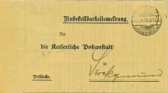 28.10.09: Faltbrief-Formular "Unbestellbarkeitsmeldung" (Type C.121 (IIa) mit Stempel WINDHUK an die Postanstalt (bzw. Gerichtskasse) in Swakopmund mit der Erklärung, dass die ausstehende Verbindlichkeit nicht erfüllt werden kann, da die Firma Wieland und Rohloff in "Liquidation" steht.
