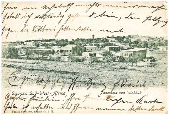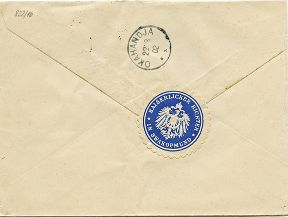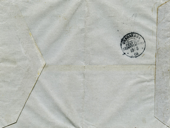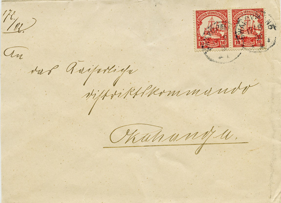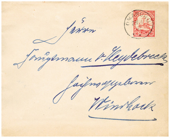 28.11.02: 10Pf (Mi.13) auf Inlandsbrief mit Stempel OMARURU an den Hauptmann v.Heydebreck (dem späterem Kommandeur der Schutztruppe) in Windhoek; rs Ankunftsstempel OKAHANDJA 4.12.02.