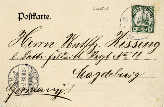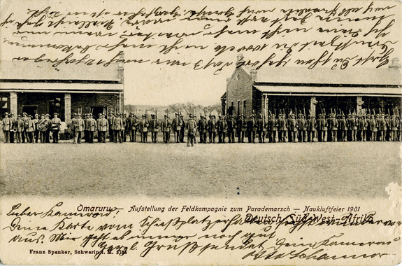 1903: Ansichtspostkarte "Omaruru ..Feldkompagnie..Naukluftfeier 1901" mit 5Pf (Mi.12) und Stempel SEEIS an den Unteroffizier Kissing in MAGDEBURG (19.10.03). Bedarfstext, der Absender beschwert sich "daß wir nach 12jähriger Dienstzeit die 1000M nicht mehr bekommen..".