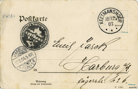 18.12.03: PFPK 4 mit blauem Gummistempel "Feld-" vor "Postkarte", Keetmanshoop Dienstsiegel und Stempel KEETMANSHOOP nach HARBURG (20.6.04); frühe Karte aus "Groendorn, den 13. Dezember 03" vom Bondelzwartsaufstand.