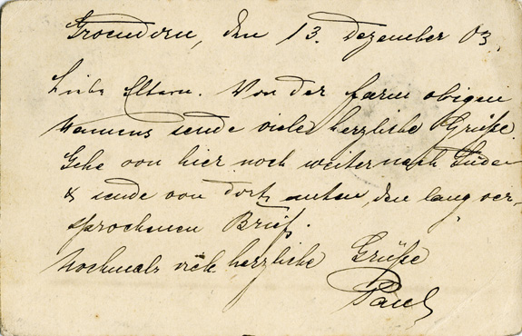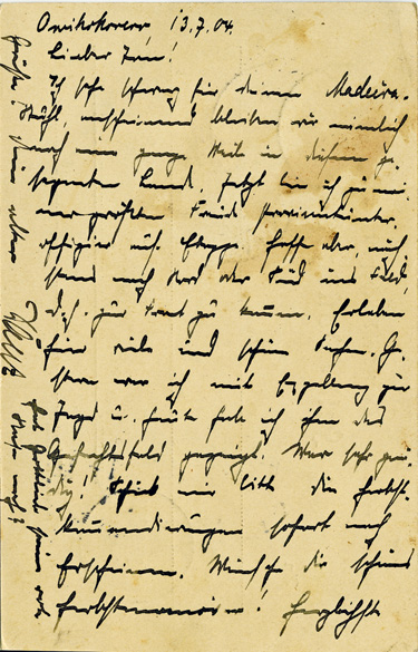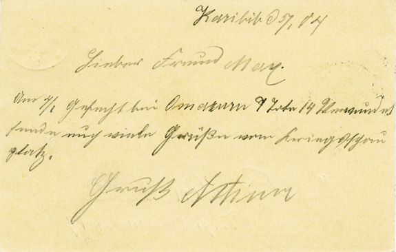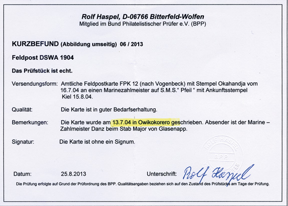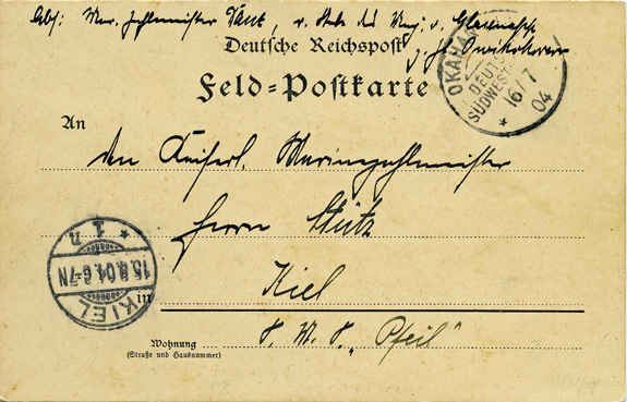 16.07.1904: Feldpostkarte (Vogenbeck FPK 12) mit Stempel OKAHANDJA an den Marinezahlmeister auf der S.M.S. "Pfeil" in KIEL (15.8.04); Absender: Marinezahlmeister Danz (Stab Major von Glasenapp) aus Owikokorero. Attest Haspel.