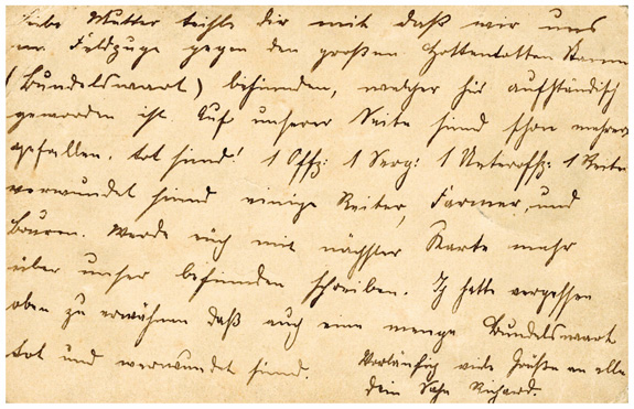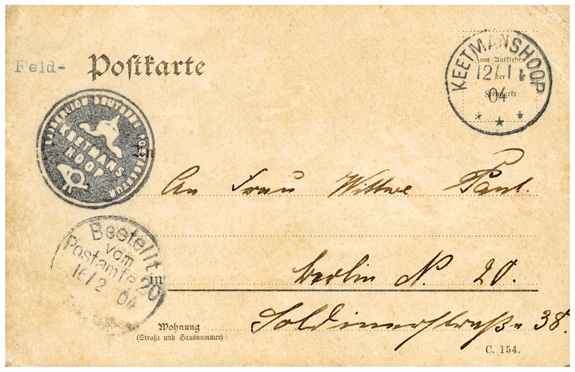 12.01.04: provisorische Feldpostkarte PFPK 4 mit Stempel und Dienstsiegel von KEETMANSHOOP nach Berlin (16.2.04). Schutztruppler Richard Paul schreibt über den Feldzug gegen die Bondelzwarts mit Angabe von Verlusten. Patina.