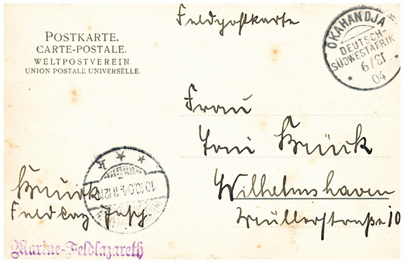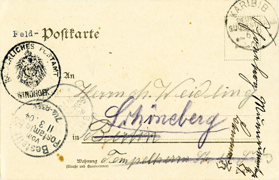 06.02.04: provisorische Feldpost-Karte PFPK 5.1 mit blauem "Feld-" vor Postkarte und Dienstsiegel von Windhoek, mit Stempel KARIBIB nach Berlin (11.3.04); Text über das Gefecht bei Omaruru am 4.2.04 "..7 Tote 14 Verwundete..".
