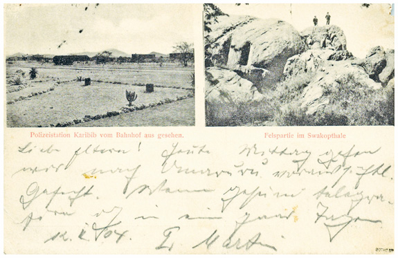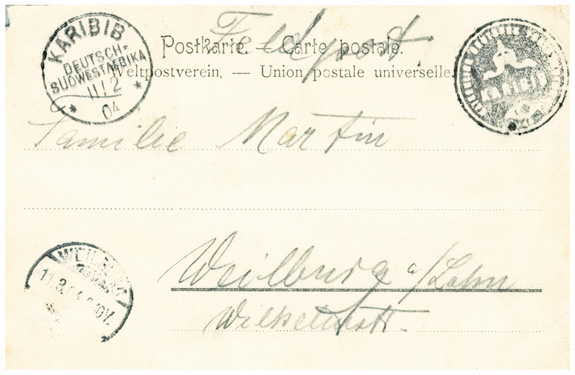 11.02.04: Negativ-Dienstsiegel (DS 18) und Poststempel von KARIBIB auf Feldpost-Ansichtskarte "Polizeistation Karibib.." nach Weilburg (11.3.04). Text: "..heute Mittag gehen wir nach Omaruru, voraussichtl. Gefecht..". Karte o/l kl.Eckfehler.