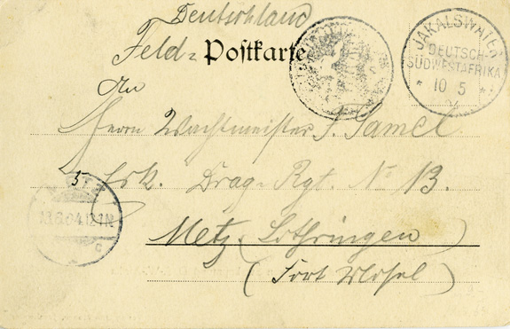 10.05.04: Feldpost-Ansichtskarte "Rhede und Strand von Swakopmund" mit Stempel und Dienstsiegel von JAKALSWATER nach Metz (13.6.04). Text: "..wir reiten jeden Tag 50km..".