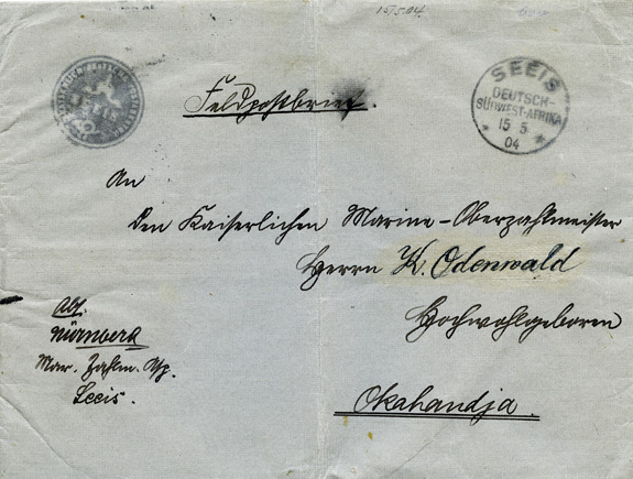 15.05.04: Feldpostbrief mit Stempel und Dienstsiegel SEEIS vom Marine-Zahlmeister Nürnberg an den Marine-Oberzahlmeister Odenwald in Okahandja (13.5.04)