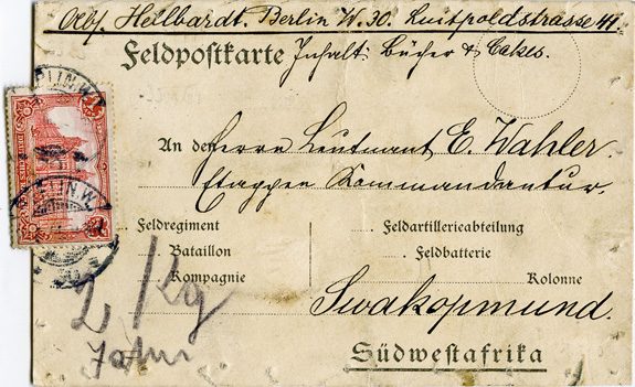 23.07.04: FPK Heimat-Südwest (PV FPK H-SWA Nr.1) als Paketadresse mit DR 1Mk von BERLIN an Leutnant Wahler bei der Etappenkommendantur Swakopmund. Normale Mängel, Marke über den Rand geklebt, die Karte war auf dem Paket aufgenäht.