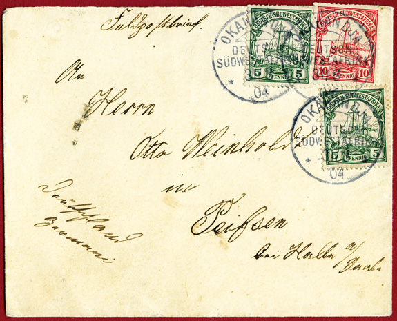 31.08.04: 2 x 5Pf und 10Pf (Mi.12,13) auf "Feldpostbrief" nach Peihsen, Marken entwertet mit Obersegmentstempel OKAHANDJA (Arge 6); fehlende Briefklappe.