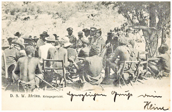 13.09.1904: Feldpost-Ansichtskarte "Kriegsgericht" (Versammlung im Veld) mit Stempel OKAHANDJA (Tages- und Monatszahl kopfstehend) und seltenem Truppenstempel "Marine-Feldlazareth" nach Wilhelmshaven. Absender: Feldlaz.Inspektor Brück. Beleg minimale Patina.