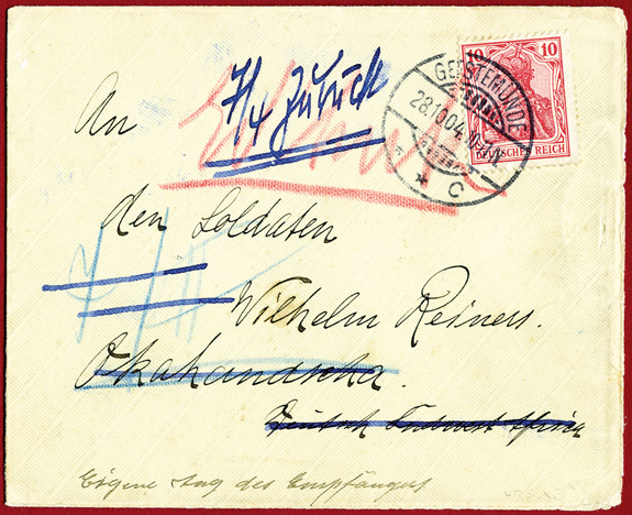 28.10.04: 10Pf (Deutsches Reich, Mi.71), entwertet GEESTEMÜNDE an einen Soldaten in Okahandja, weitergeleitet an die Einheit 7/II, dann nach Windhuk, siehe roten Vermerk, Hier erhielt der Brief rückseitig den sehr seltenen Stempel: "Empfänger selbst mit Hilfe der amt-/lichen Listen nicht zu ermitteln / Postamt Windhuk" (Vogenbeck Nr.18, 200 Punkte).