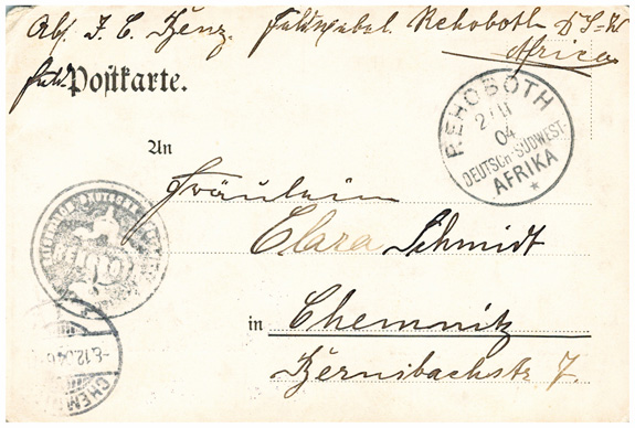 02.11.04: Feldpost-Ansichtskarte mit Negativ-Dienstsiegel & Stempel von REHOBOTH nach Chemnitz (6.12.04). Feldwebel Benz von der Basterkompagnie schreibt "..mache sobald ich gesund bin den Feldzug gegen die Witbooihottentotten mit..".