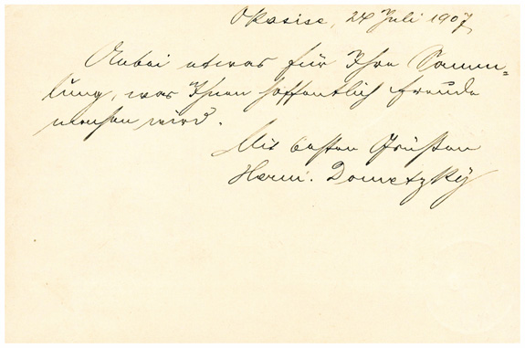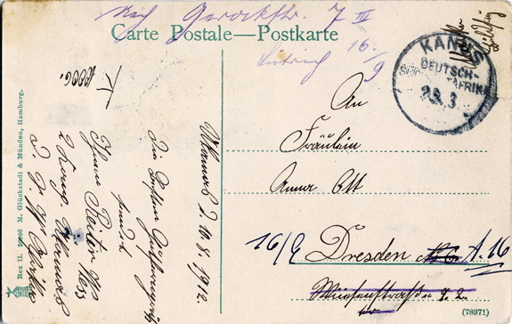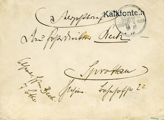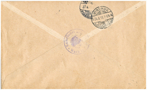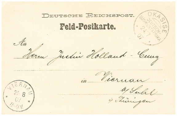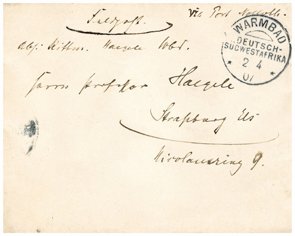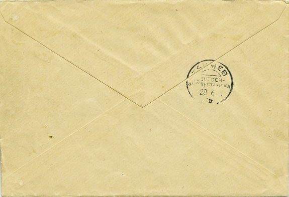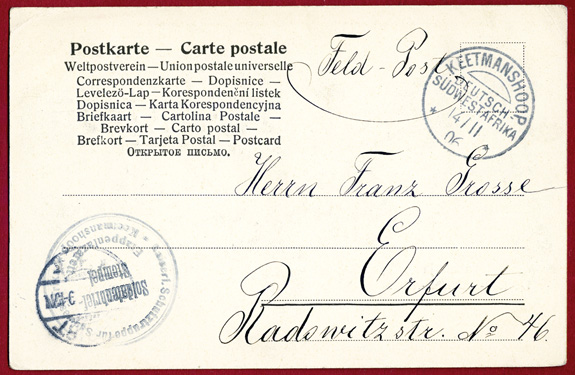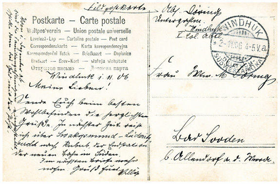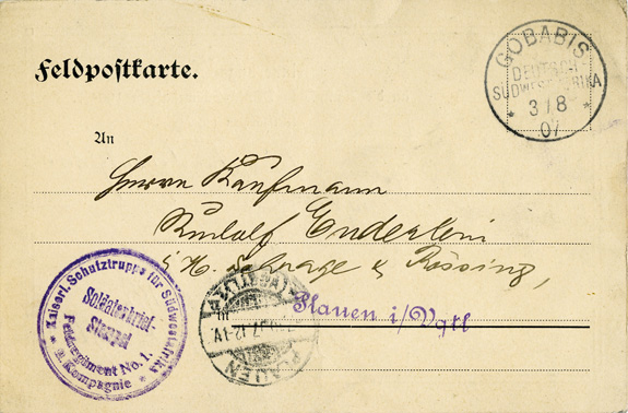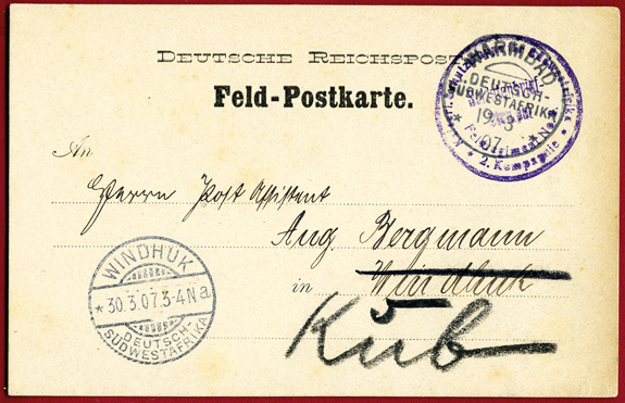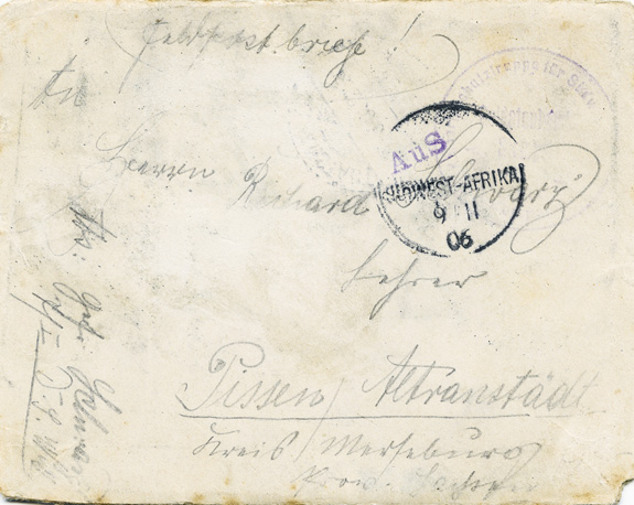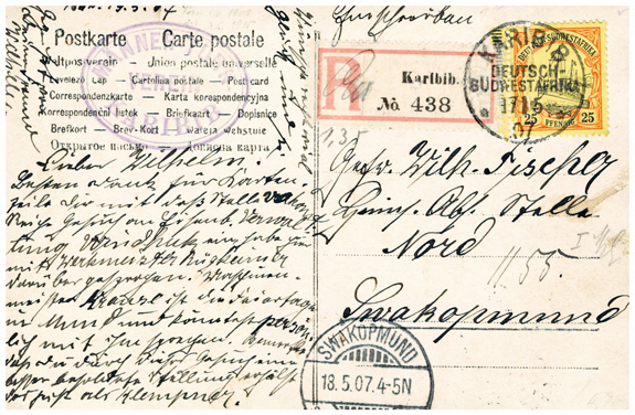 19.10.06: FPK von LÜDERITZBUCHT an Hauptmann Siebert der 8.Batterie in Lutboom, als Irrläufer via HASUUR (10.12.) mit Vermerk "Über Keetmanshoop heimgereist" und TrSt Swakopmund (21.2.07) nach Berlin (19.5.07) nachgesandt.