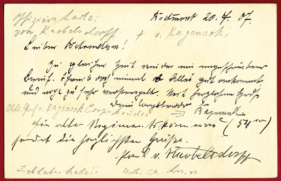21.04.07: 5Pf Ganzsachenkarte (Schiffszeichnung, Mi.P13) von KUB mit Soldatenbriefstempel "Feldregiment No.1 / 1. Kompagnie" (Vogenbeck 10, 60,-), nur 6 Monate in Kub verwendet; Absender: von Kageneck und von Knobelsdorf (als Grusszeile).