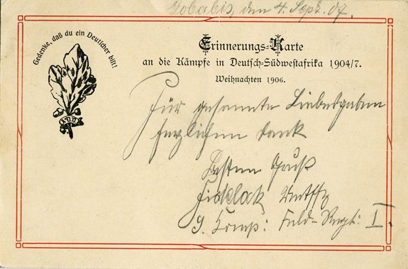 03.08.07: Liebesgaben-Karte LFPK 14 "Erinnerungs-Karte an die Kämpfe in Deutsch-Südwestafrika 1904/07./Weihnachten 1906" mit Stempel GOBABIS und SB-Stempel "Feldregiment No.1/9.Kompagnie" (PV 20) nach Plauen (7.10.07).