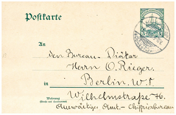 13.03.1909: 5Pf Ganzsachenkarte (Mi.P17) mit Stempel KEETMANSHOOP an das "Auswartige Amt. - Chiffrierbureau" in Berlin. Absender ist "A.Sterz", Oberfeuerwerker im Stab des Etappenkommando Süd.
