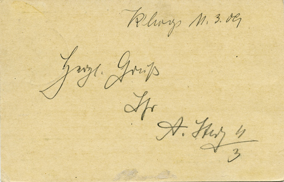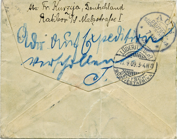 12.08.09: DR 10Pf auf Brief aus RATIBOR an "Alfons Kurzeja, per Herrn Knöffel, Fabrikbesitzer in Lüderitz-Bucht (oder Aus)", rs mit AkSt LÜDERITZBUCHT (11.9.09) bzw. AUS (7.10.09) und blauem Vermerk "Adr(essat) auf Expedition verschollen" und vs Vermerk "zurück". Nähere Umstände sind nicht bekannt. Umschlag Mittelbug.
