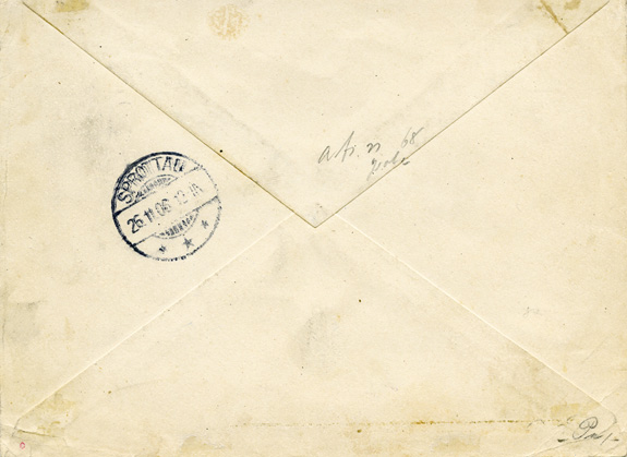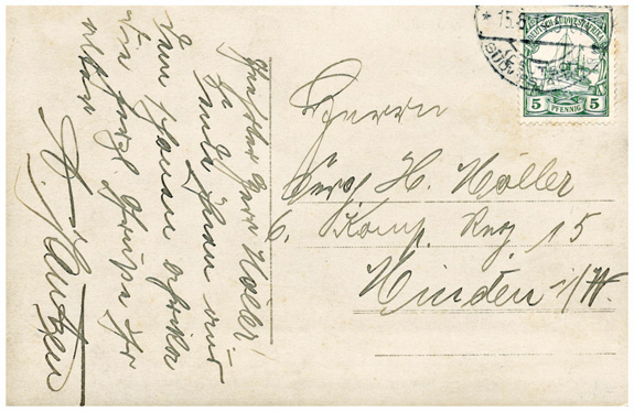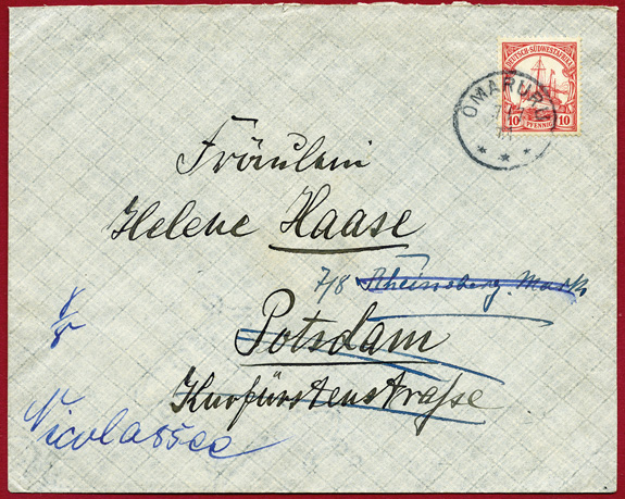 07.07.11: 10Pf (Schiffszeichnung mit Wasserzeichen, Mi.26) mit Stempel OMARURU auf Brief nach Potsdam, weitergeleitet nach Rheinsberg und dann nach Nicolassee; rückseitig etliche Vermerke. Absender ist Oberlt. von Knobelsdorf.