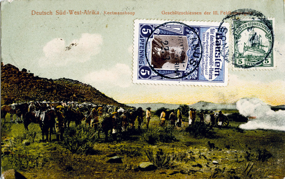 23.08.12: 5Pf (Mi.25) und Vignette "Baustein für das Kosmopolit-Heim" je mit Stempel KANUS (ohne Jahreszahl "12") bildseitig auf AK "Geschützschiessen der III.Feldkompagnie" nach Dresden. Absenderangabe aus "Ukamas d. 10.8.1912".