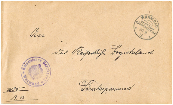 20.08.13: portofreier RDS-Brief mit Stempel WARMBAD und Adlerstempel vom Bezirksamt Warmbad über Windhuk (24.8.13) an das Bezirksamt in Swakopmund.