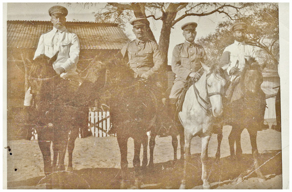 02.11.06: s/w Fotoansichtskarte als Feldpostkarte (4 berittene Pferde mit Offizieren) aus WINDHUK von einem "Unteroffizier./Windhuk./V.Col.Abtl", der von seinen Reisen über "Swakopmund, Lüderitzbucht & Kubub.." berichtet.