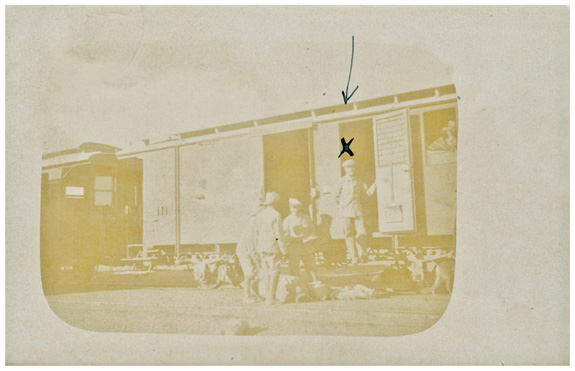 15.06.14: Foto-Ansichtskarte von einigen Soldaten vor Bahnwagon, mit 5Pf (Mi.25) von Lüderitzbucht (Teilabschlag des Stempels, Datum sichtbar) nach Minden/Westf.