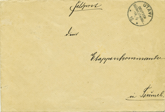 28.06.1915: Feldpost-Dienstbrief mit Stempel OTAVI (im Zeitraum 26.6. - 1.7.15 bei der Feldpoststation in Otavi selten verwendet) an das Etappenkommando in TSUMEB (28.6.1915).