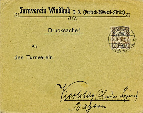 14.06.1906: 3Pf (Mi.11) mit Stempel WINDHUK "a" als Drucksache auf dekorativem Vordruckbrief "Turnverein Windhuk D.T. (Deutsch-Südwest.." an den Turnverein in VIETACH/Niederbayern (17.7.06).