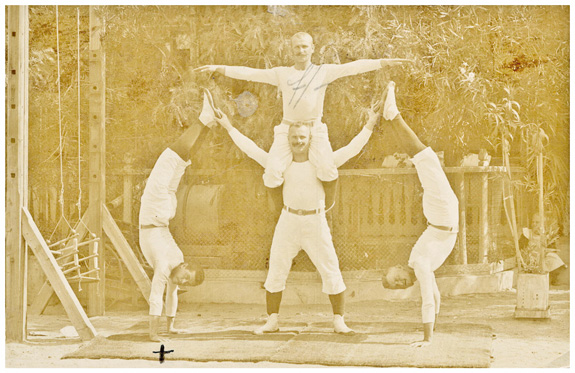 17.05.1907: Fotoansichtkarte des "Männer Turnvereins Karibib" als Einschreibe-Bedarfskarte mit beschädigter 25Pf (Mi.15) & Stempel KARIBIB sowie R-Zettel nach SWAKOPMUND (18.05.07); rs violetter Turnvereinsstempel.